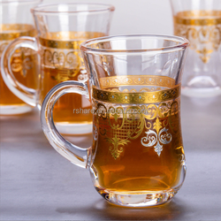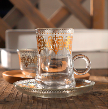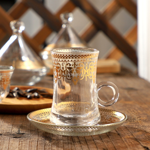 Tazze da caffè da tè in vetro arabo mediorientale all'ingrosso con Set di piattini, set di tazze da caffè riutilizzabili con bordo dorato per il mese del Ramadan